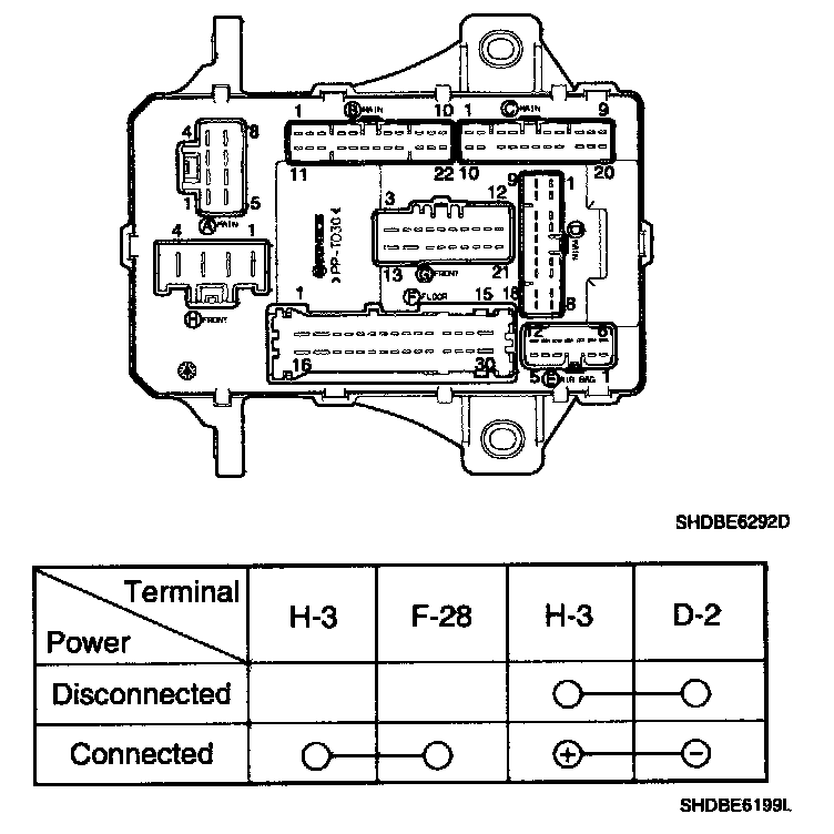4. There should be continuity between the No. 3 terminal in the I/P-H and the No. 2 terminal in the I/P-D when power and ground are connected to the No. 3 terminal in the I/P-H and the No. 28 terminal in the I/P-F.
