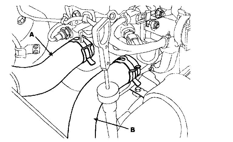 5. Remove the upper radiator hose (A) and lower radiator hose (B).