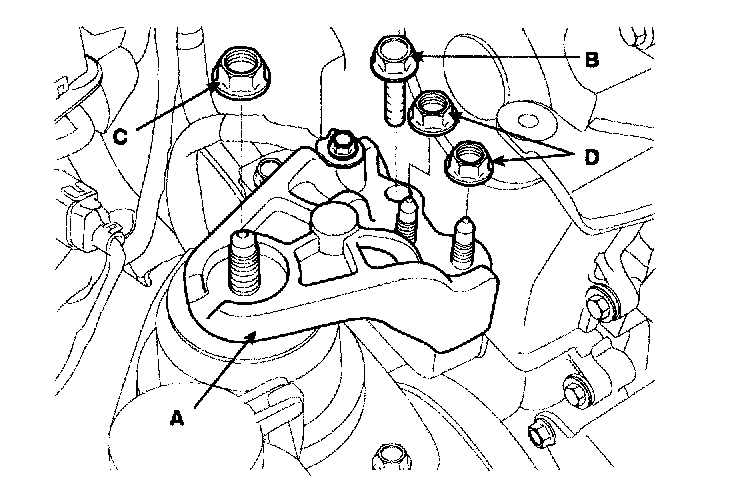 16. Remove the engine mounting bracket (A) by removing the bolt (B) and nuts (C, D).