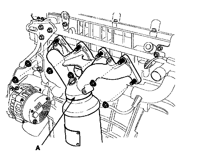 5. Remove the exhaust manifold and catalytic converter assembly (A).