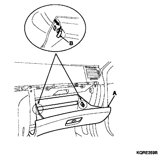 1. Open the glove box (A). Lower the glove box down completely by removing the glove box stopper (B) to the glove box.