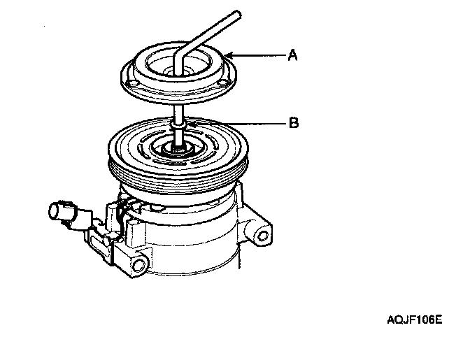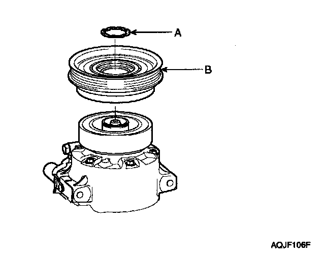 - Be careful not to damage the pulley (B) and compressor during removal/installation.