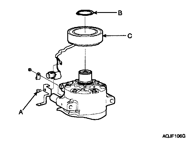 4. Remove the screw (A) from the field coil ground terminal. Remove the retainer ring (B) and then remove the field coil (C) from the shaft with a puller. Be careful not to damage the coil and compressor.