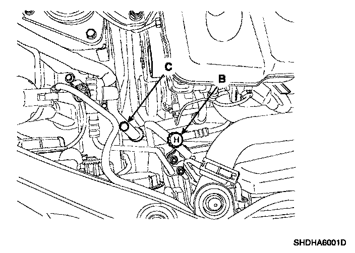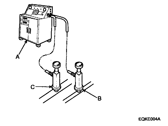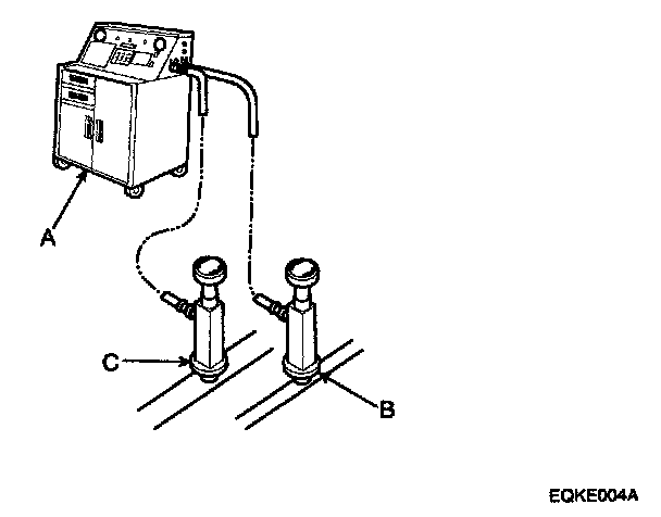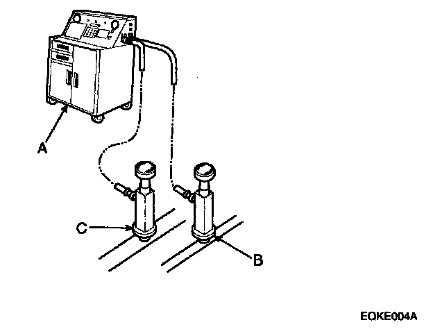 Recovery/Recycling/Charging System (A) to the high-pressure service port (B) and the low-pressure service port (C) as shown, following the equipment manufacturer's instructions.