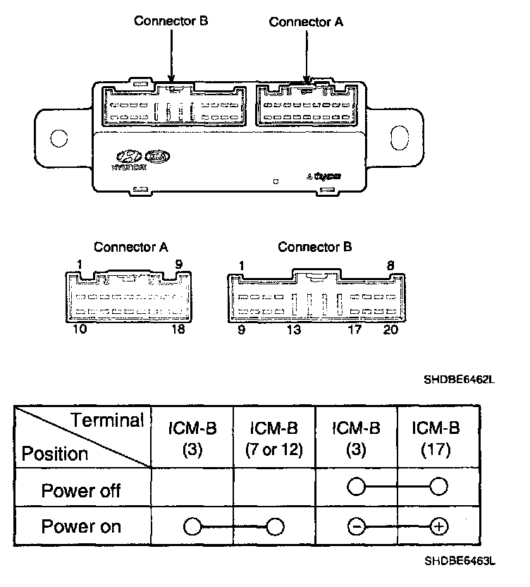3. Check for continuity between terminals. There should be continuity between the No. 3 and No. 12 or No. 7 of ICM-B terminals when power and ground are connected to the No. 3 and No. 17 of ICM-B terminals.