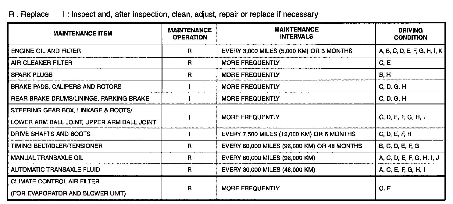 The following items must be serviced more frequently on cars normally used under severe driving conditions. Refer to the chart below for the appropriate maintenance intervals.