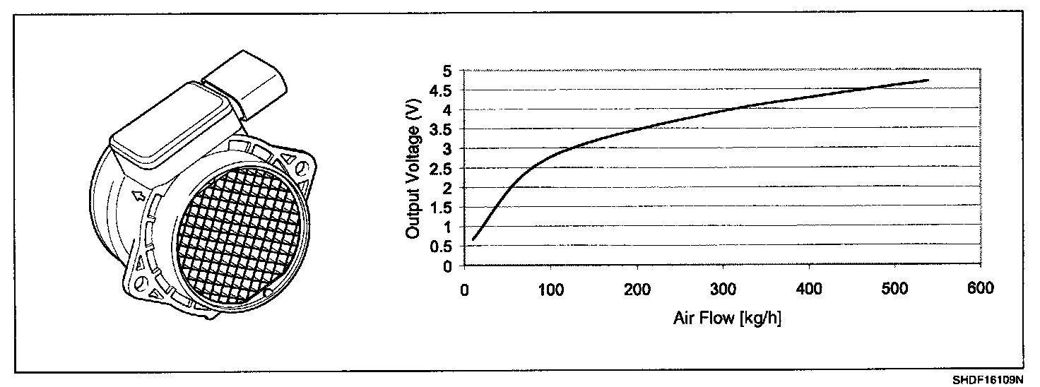 Mass Air Flow Sensor (MAFS) is a hot-film type sensor and is located in between the air cleaner and the throttle body. It consists of a tube, a sensor assembly and honeycomb cell and detects intake air quantity flowing into the intake manifold. Air flows from the air cleaner assembly through the honeycomb cell and over the hot film element. At this time, heat transfer is generated by convection and this sensor loses its energy. This sensor detects the mass air flow by using the energy loss and transfers the information to the ECM by voltage. The ECM calculates fuel quantity and ignition timing.
