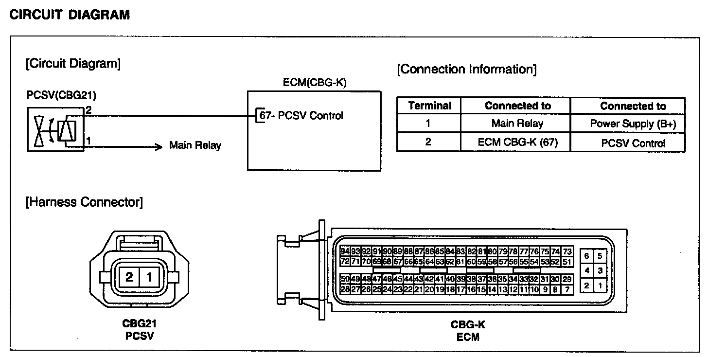 Purge Control Solenoid Valve (PCSV) is installed on the surge tank and controls the passage between the canister and the intake manifold. It is a solenoid valve and is open when the PCM grounds the valve control line. When the passage is open (PCSV ON), fuel vapors stored in the canister is transferred to the intake manifold.