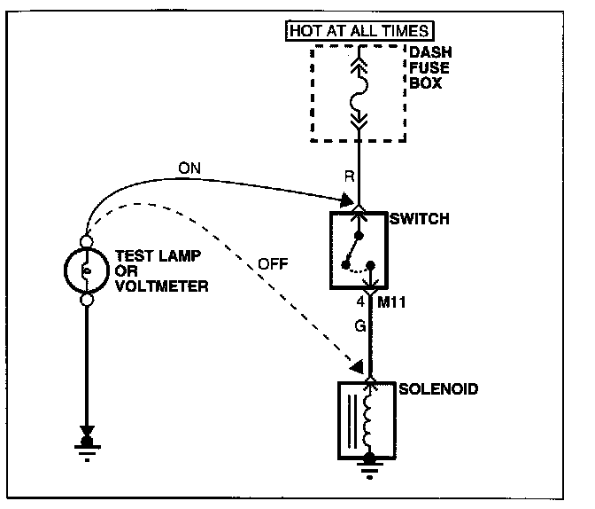 A. Connect one lead of a test lamp or voltmeter to a ground. If you are using a voltmeter, be sure it is the voltmeter's negative test lead you have connected to ground.