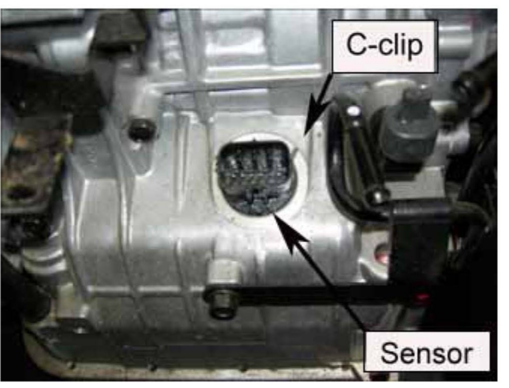 13. Remove the C-clip from the solenoid connector and remove the fluid temperature sensor.