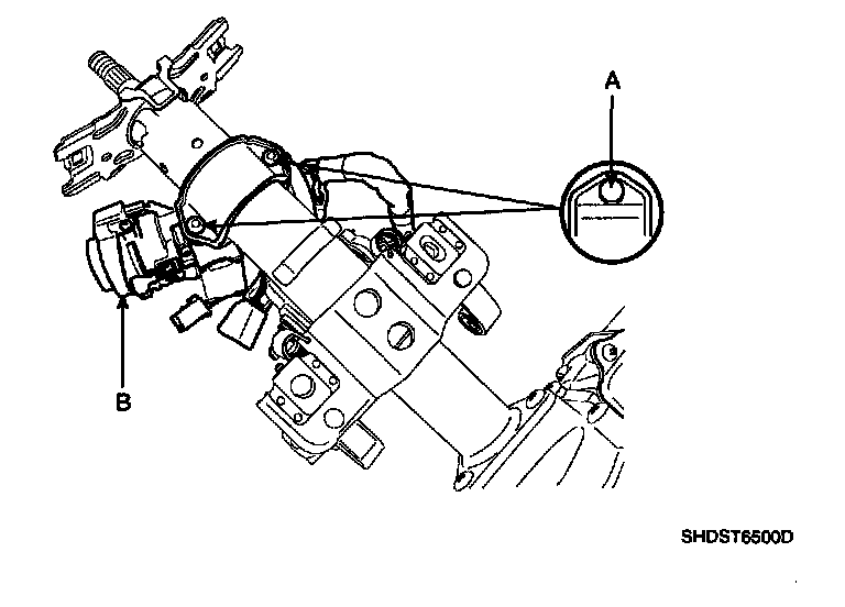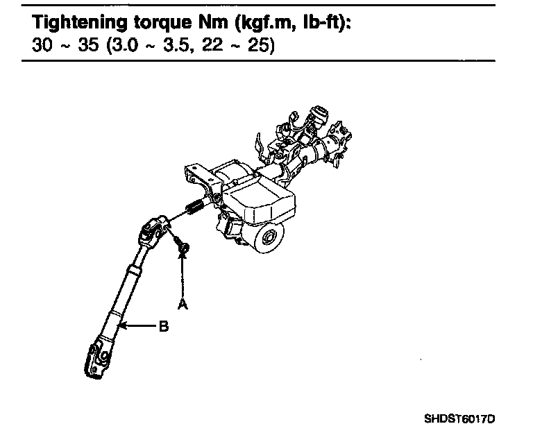 1. Loosen the bolt (A) and then disconnect the universal joint assembly (B) from the steering column assembly
