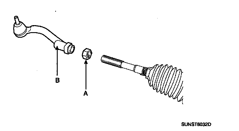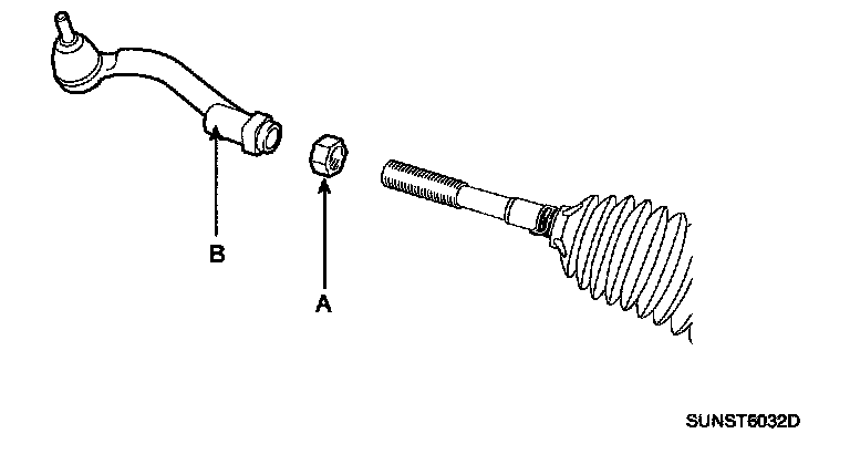 2. Loosen the lock nut and then remove the tie rod end (B) and lock nut (A) from the tie rod.