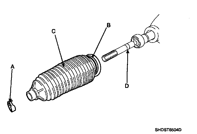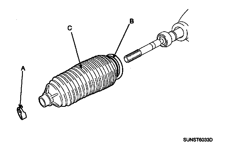 3. Remove the bellows clip (A) and band (B) and then pull the bellows (C) away from the end of the tie rod.