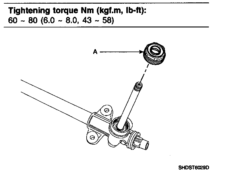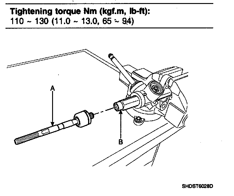 9. Apply Loctite (Three bond-1374) to the thread of the tie rod inner ball joint and then assemble the tie rod (A) to the rack bar (B).