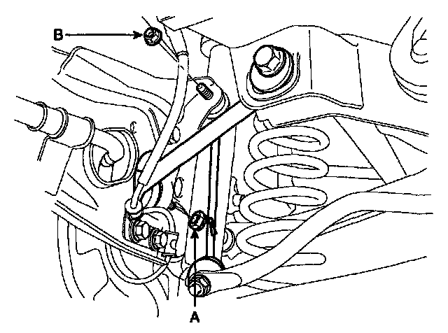 3. Disconnect the rear stabilizer link with the trailing arm by loosening the nut (B).
