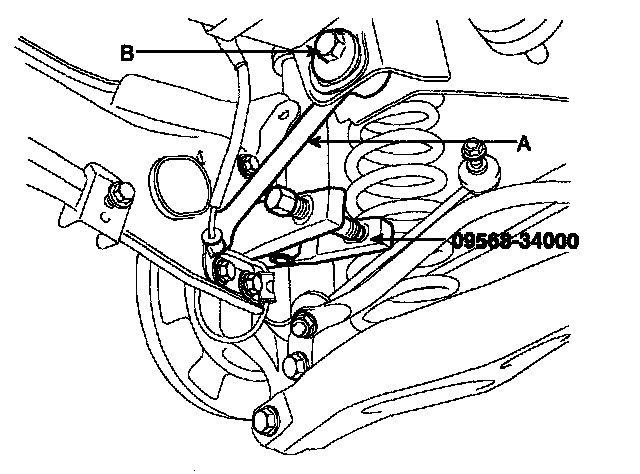 5. Loosen the nut and then remove the cam bolt (B) rear assist arm (A) from the cross member.