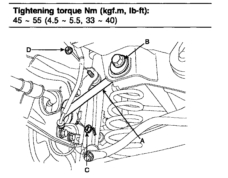 4. Connect the rear stabilizer link with the trailing arm and then tighten the nut (D).