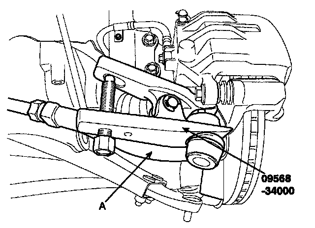 4. Remove the split pin and castle nut and then disconnect the tie rod end (A) from the front knuckle by using a SST (09568-34000).