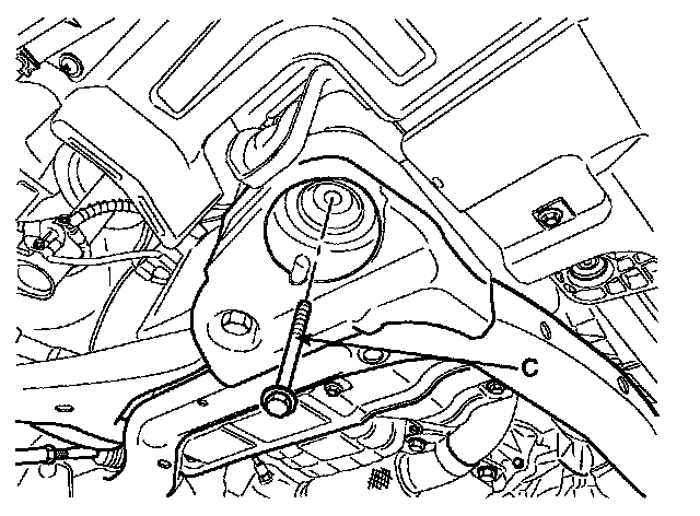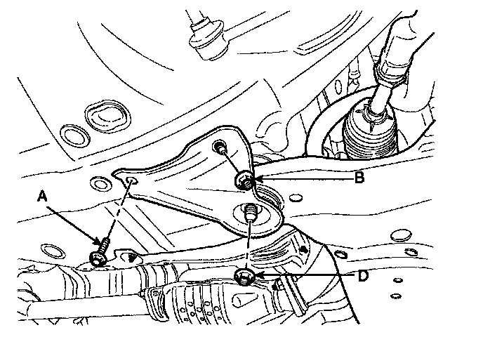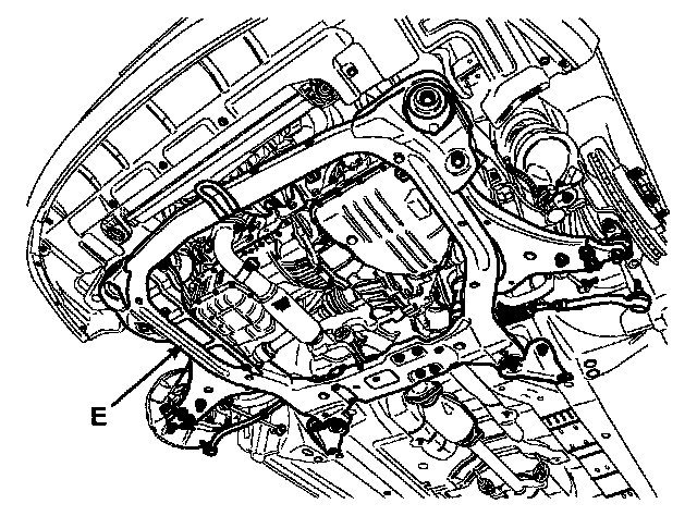 9. Remove the sub frame (E) and the sub frame stay by loosening the mounting bolts (A, C) and nuts (B, D).