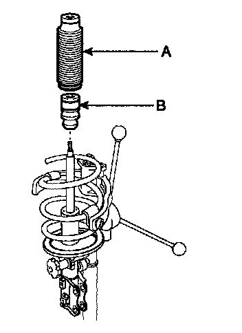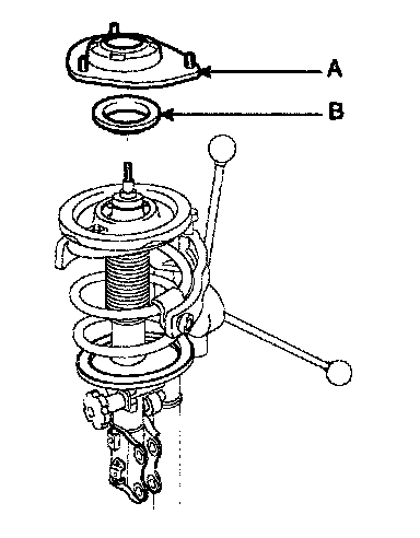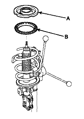 3. Remove the insulator assembly (A) and the strut bearing (B).