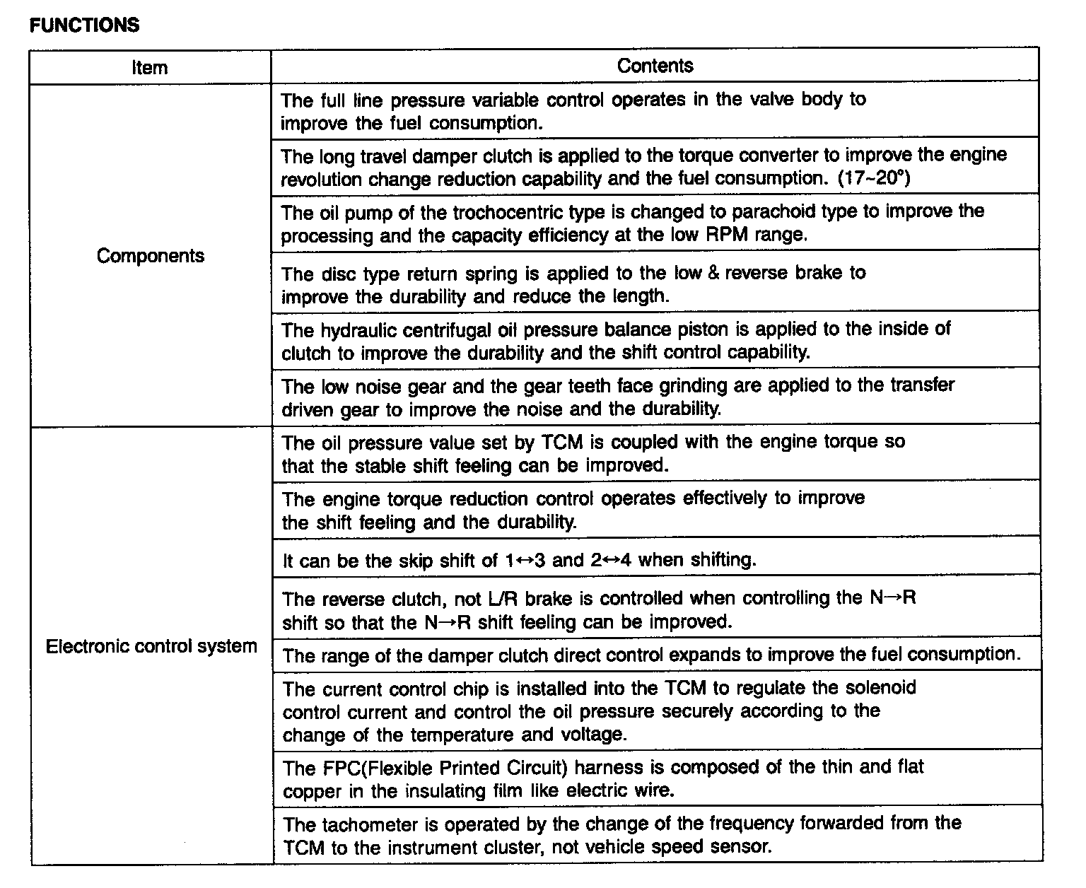 The transaxle (A4CF2) is improved on the durability, fuel consumption and efficiency by the new main features as followed.