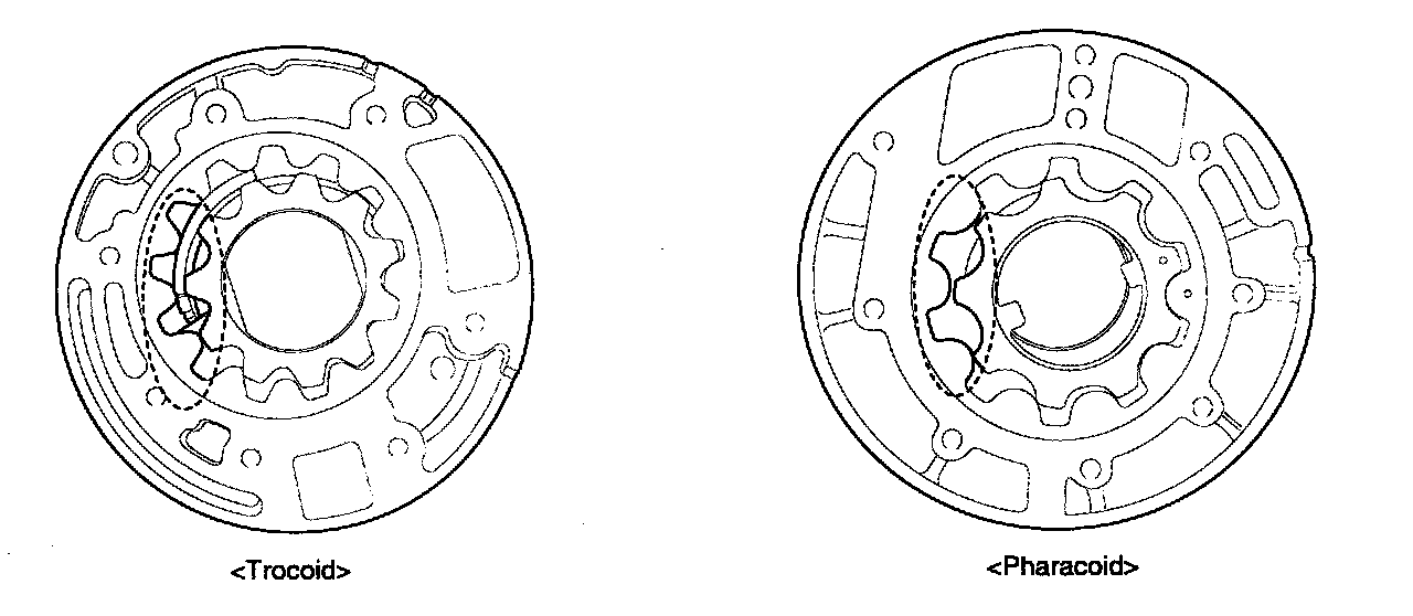The oil pump is made of the aluminum (the reaction shaft support) to loose the weight and selects the parachoid type to improve the processing and the capacity efficiency at the low RPM range.