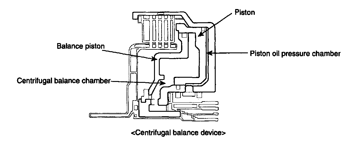 The hydraulic centrifugal oil pressure balance device places inside the clutch assembly. Generally the oil remained in the piston oil pressure chamber pushes the piston by the centrifugal force. But to prevent the piston from being pushed, the oil filled in between the piston and the return spring retainer occurs the centrifugal force and both of the power is offset so that the piston don't move. In result, it improves the durability and the shift control ability.