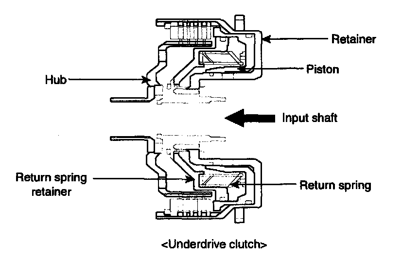 The operating oil pressure in the underdrive clutch components operates between the piston and the retainer and pushes the piston to the clutch discs to deliver the driving force from the retainer to the hub.
