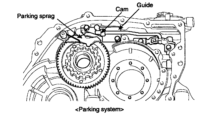 The parking system for A4CF2 model is the cam type. The roller type installed to the existing new generation AT needs the support to move the roller when operating the parking system and is so complicated. But the cam type for A4CF2 model doesn't need the support and the structure is simply. It only needs the guide to prevent from moving the cam idly.