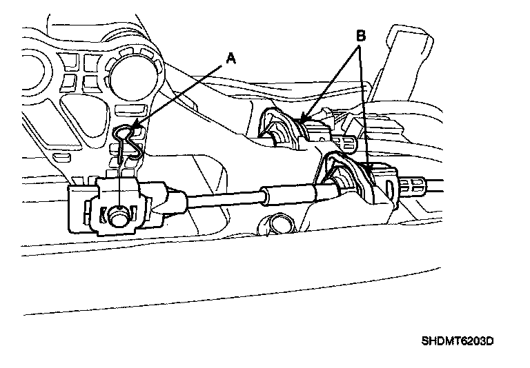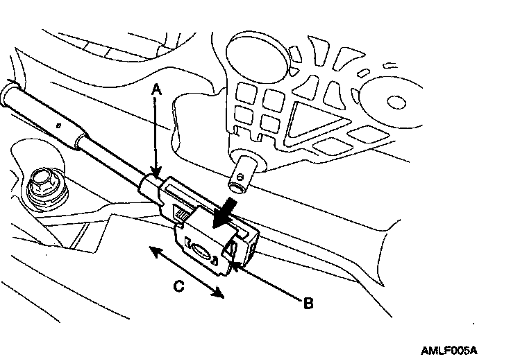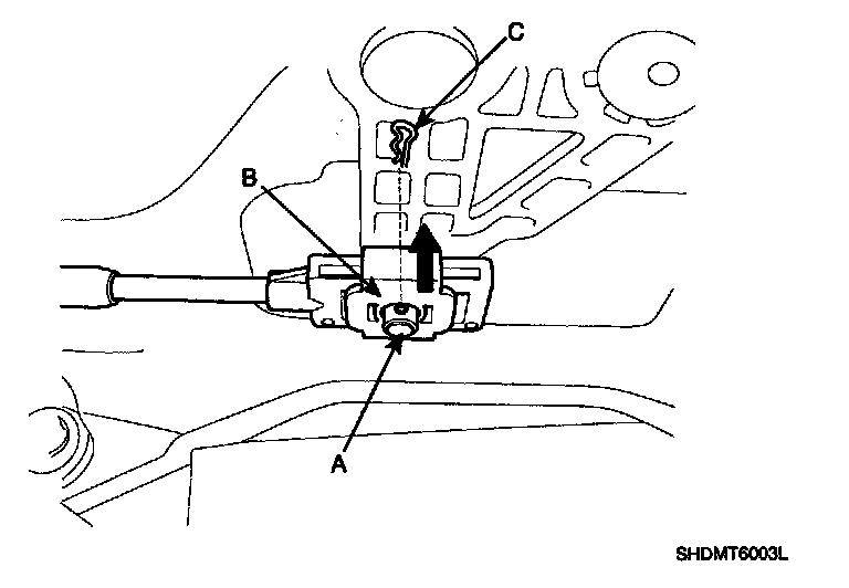 7. Adjust the slide clip (B) to fit it into the select lever pin (A) and install the snap pin (C).