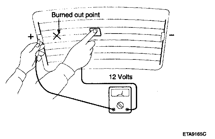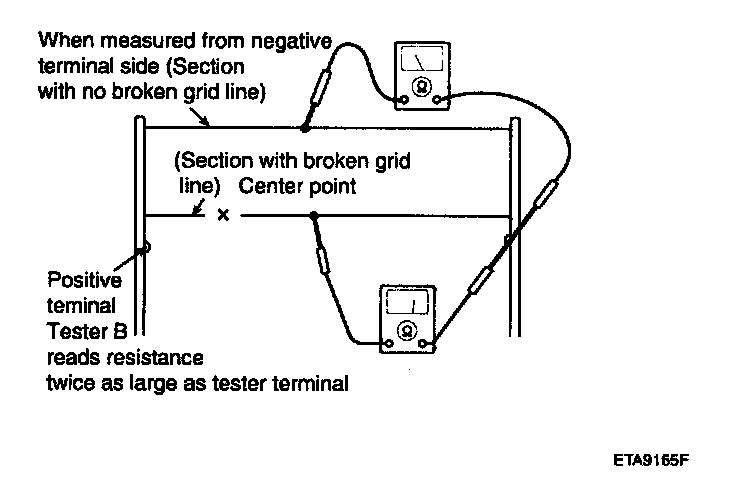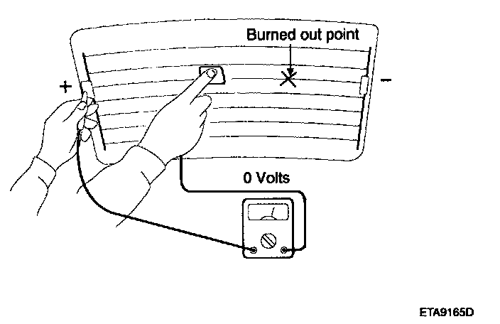 5. Use an ohmmeter to measure the resistance of each heater line between a terminal and the center of a grid line, and between the same terminal and the center of one adjacent heater line. The section with a broken heater line will have a resistance twice as that in other sections. In the affected section, move the test lead to a position where the resistance sharply changes.