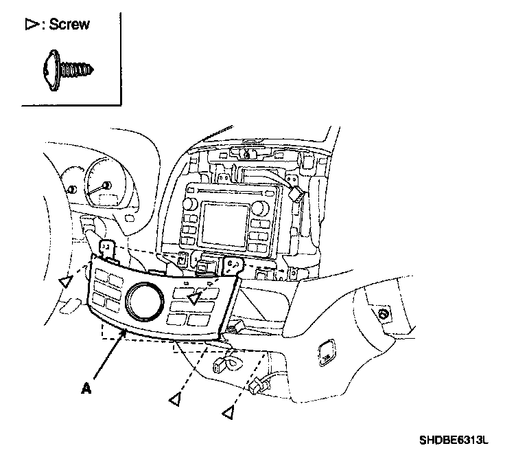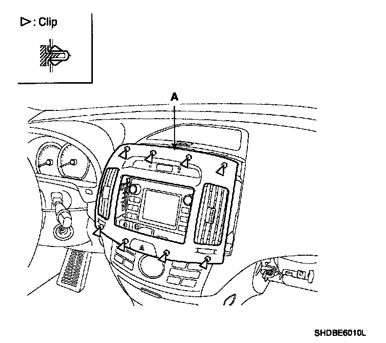 2. Remove the center facia panel (A). Take care not to damage fixing clips.