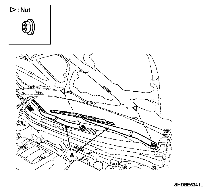 1. Remove the windshield wiper arm and blade after removing a nut (A).