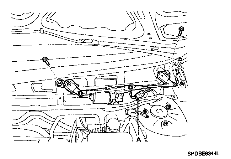 3. Remove the windshield wiper motor and linkage assembly after removing 2 bolts. Disconnect the wiper motor connector (A) from the wiper motor & linkage assembly.