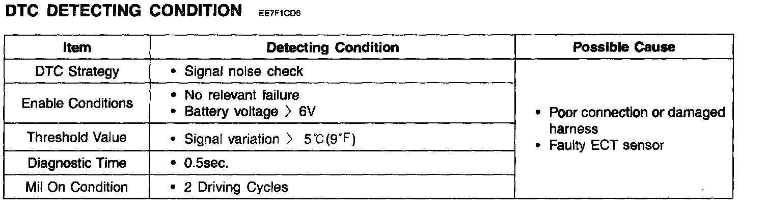ECM sets DTC P0119 if the ECM detects signal increasing ratio exceeds the possible range of a properly operating ECTS.
