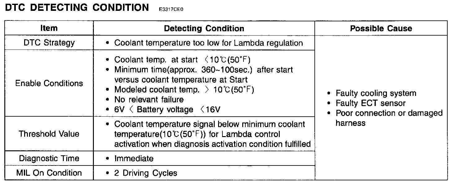 The purpose of this diagnosis is to monitor the minimum coolant temperature that enables lambda closed loop control after start. Minimum coolant temperature to run lambda control must be reached before the threshold time predetermined. If the lambda control is not active because of low engine coolant temperature within predetermined minimum time after start, the ECM sets DTC P0125.