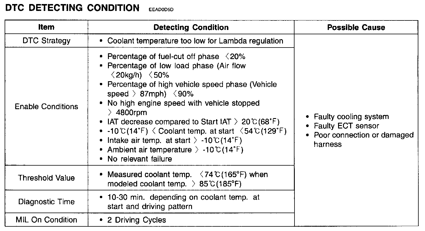 An open stuck thermostat means an increase of the engine warm up time and can cause emission increase as well. To detect open stuck thermostat, the ECM Checks measured coolant temperature as soon as calculated coolant temperature reaches threshold and sets DTC P0128 when measured coolant temperature is lower than threshold. If same code is set again in the next driving cycle, MIL is illuminated.