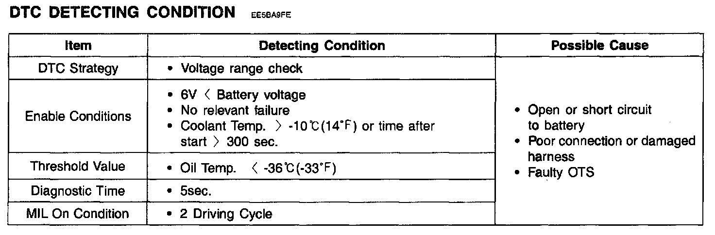 ECM sets DTC P0198 if the ECM detects signal voltage higher than the possible range of a properly operating OTS.