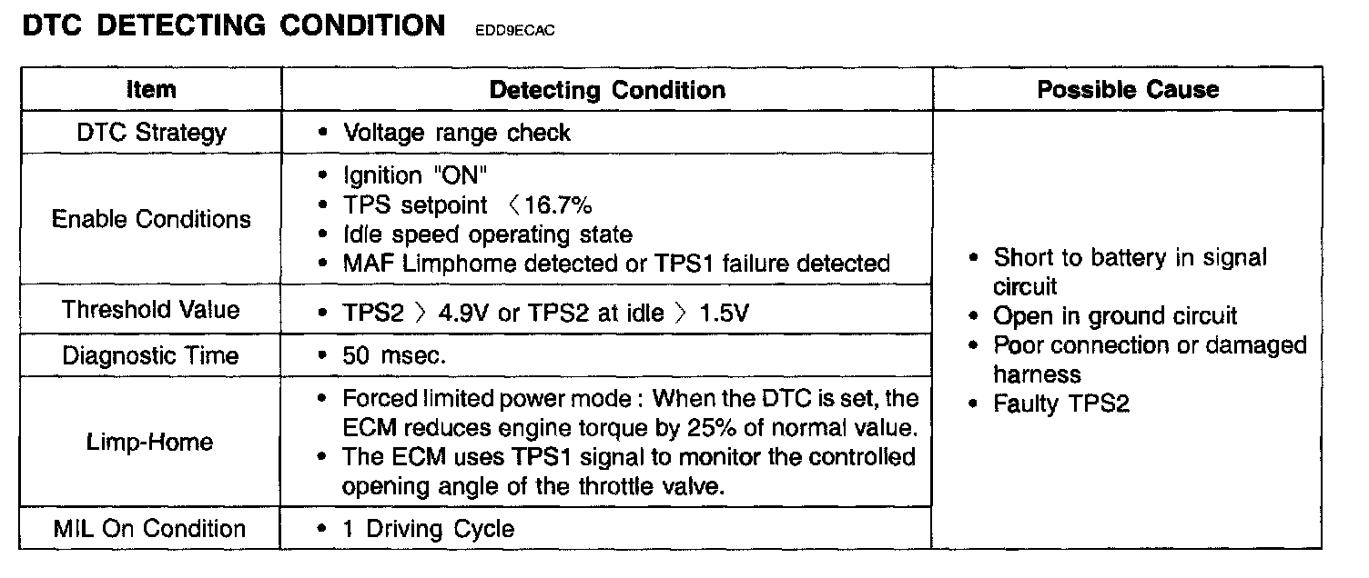 ECM sets DTC P0223 if the ECM detects signal voltage higher than the possible range of a properly operating TPS2.