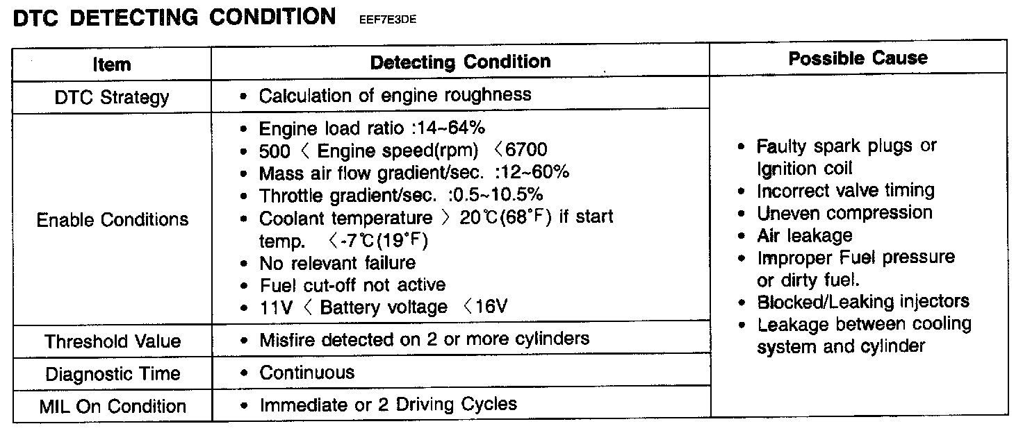 If the ECM detects that engine speed variation indicates a misfire sufficient to cause three-way catalyst converter damage or emissions level to exceed standard value, the ECM sets misfire DTC P0301 ,P0302, P0303 or P0304. If the misfire rate is high enough to damage the catalyst, the MIL will flash to alert the vehicle operator. With a more than two cylinder misfire detection, the ECM sets P0300.
