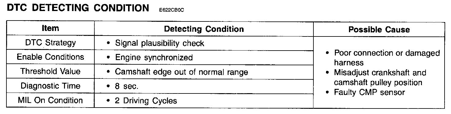 - If fail to synchronize with CKP sensor, check that the crankshaft and camshaft are correctly aligned the matching marks of the pulleys. Repair or readjust as necessary and go to "Verification of Vehicle Repair" procedure