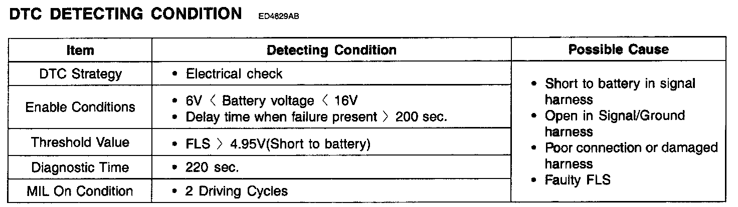 The Fuel Level Sensor (FLS) measures the fuel level in fuel tank and its information is used to supply the ECM with information regarding the monitoring condition of the EVAP canister purge system for leak detection. If the fuel level sensor is monitored for high or low stuck or difference between voltage of fuel level sensor and voltage deviation of fuel level sensor is exceeds limited value while driving, this is interpreted by the ECM as a fault.