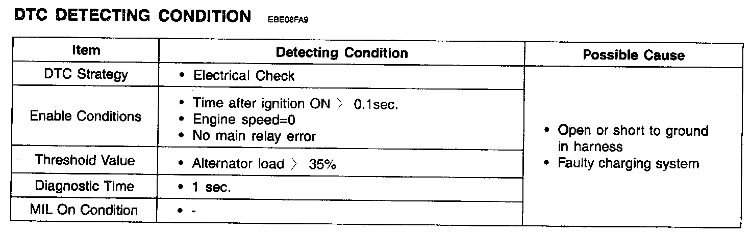 Alternator output and power demand of all electrical loads and systems must be matched to each other as ideally as possible so that the entire system is reliable and trouble-free in operation. The ECM monitors alternator output deviation from the signal of the FR terminal of the alternator when the engine is running.