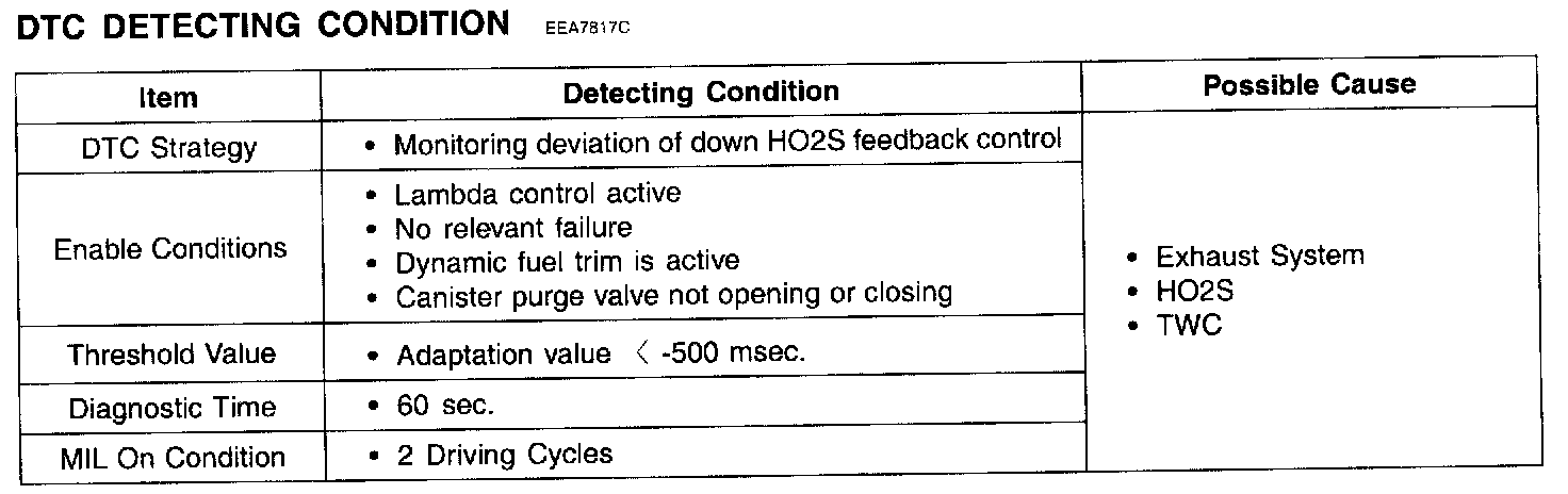 If the lambda controller reaches the maximum or minimum threshold, then feedback control is no longer possible and emissions will be increased. The ECM sets DTC P2097 if no proportional post catalyst fuel trim adaptation occurs for defined time after the lambda controller has reached its minimum threshold.