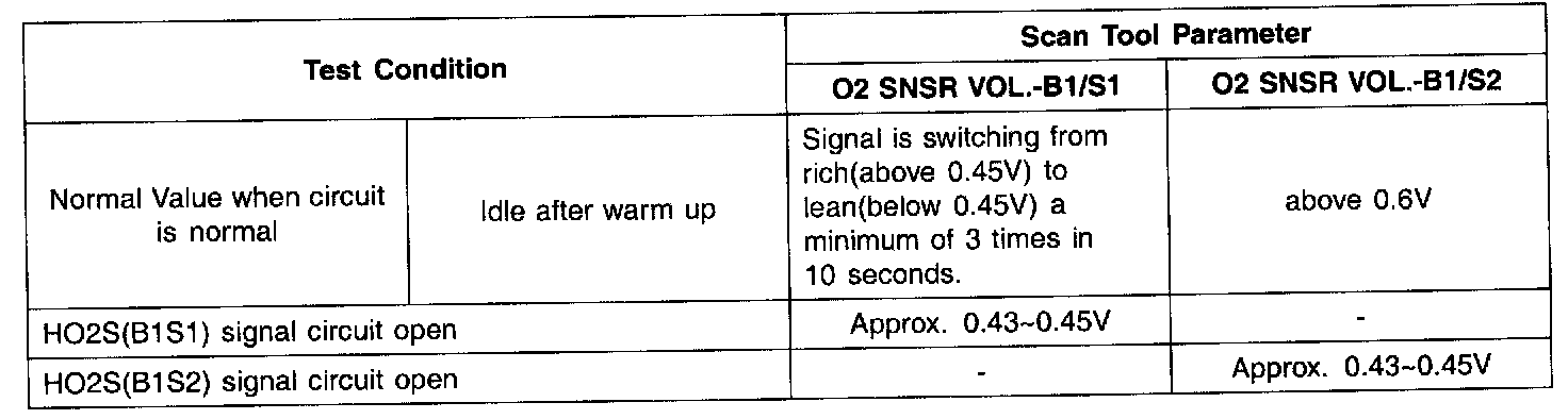 - Rear HO2S (O2 SNSR V0L.-B1/S2) : Above 0.6 V at idle