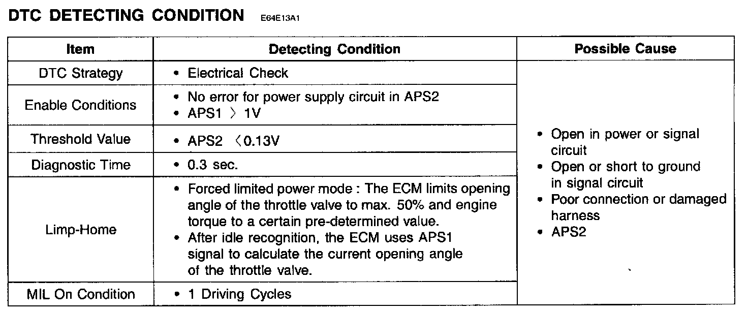 ECM sets DTC P2127 if the ECM detects output voltage lower than the possible range of a properly operating APS 2.