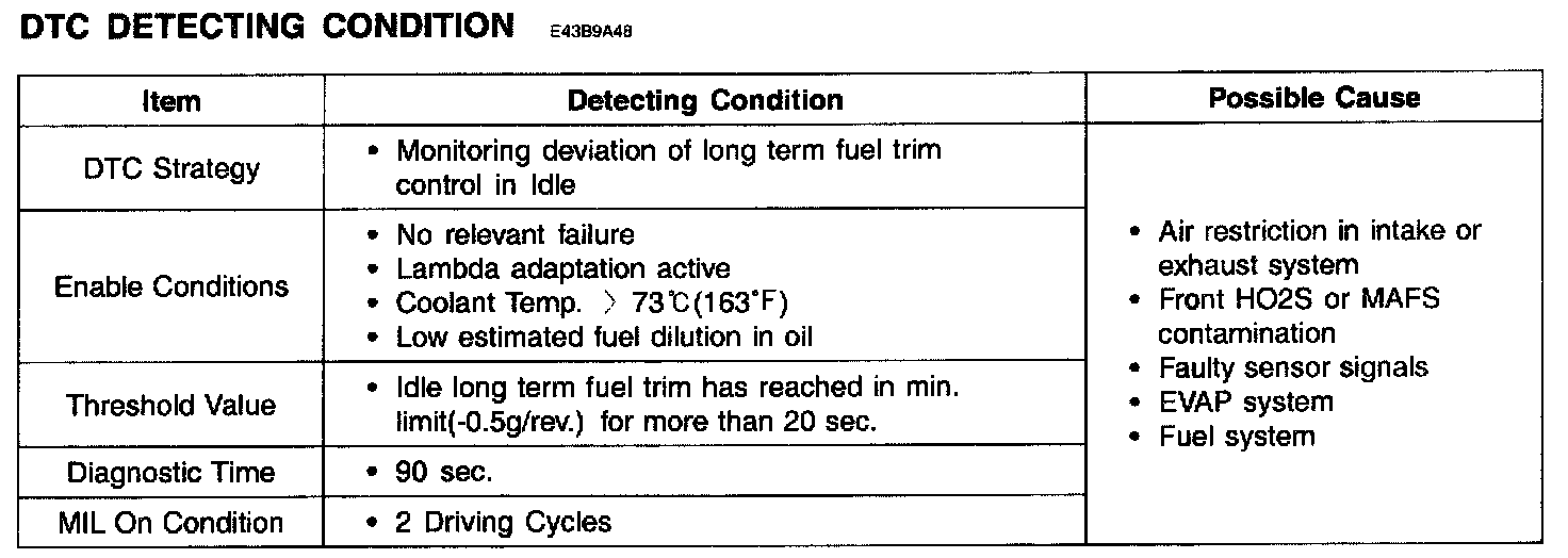 If the lambda controller reaches the maximum or minimum threshold, then feedback control is no longer possible and emissions will be increased. The ECM sets DTC P2188 if no proportional post catalyst fuel trim adaptation occurs for a defined time after the lambda controller has reached its minimum threshold at idle.