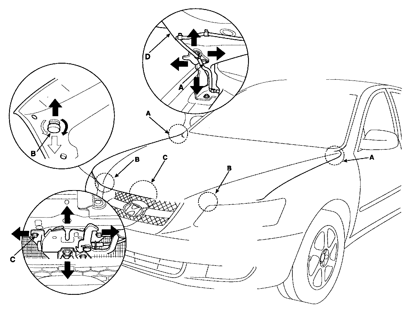 3. After loosening the hood latch (C) mounting bolts, adjust the latch by moving it up or down, or right or left.