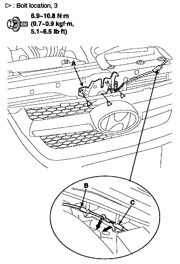 3. Disconnect the hood latch cable (B) and release cable (C).