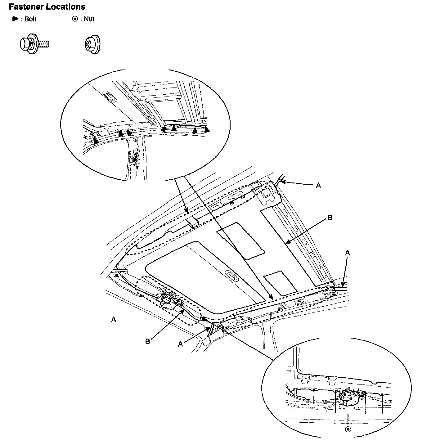 3. After loosening the mounding bolts and nuts, remove the sunroof assembly (B).